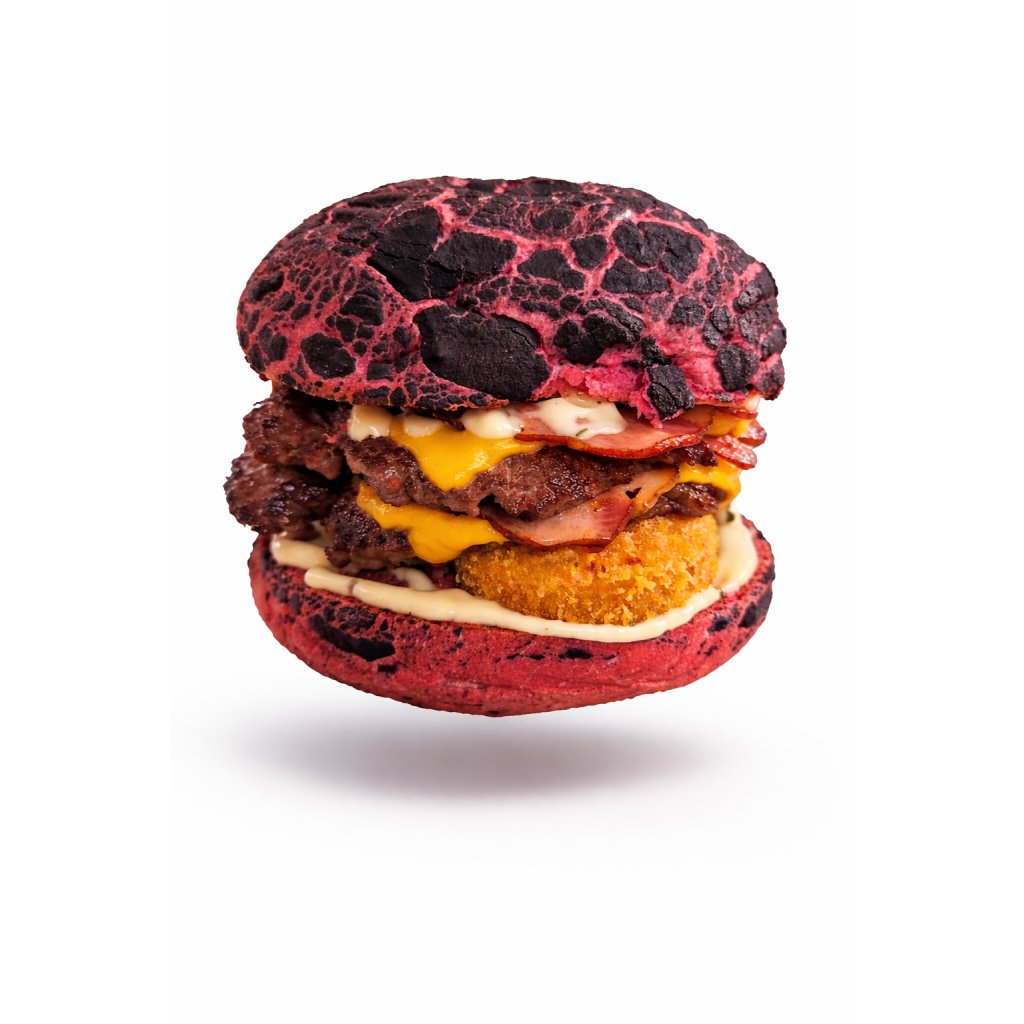Bulky momentálně vyrobené pouze pro Zeus Burgers, slaninový dip, 3 kousky uzených sýrových donutků, 2 chedary, dvě slaniny, rajče a samozřejmě hovězí masíčko.