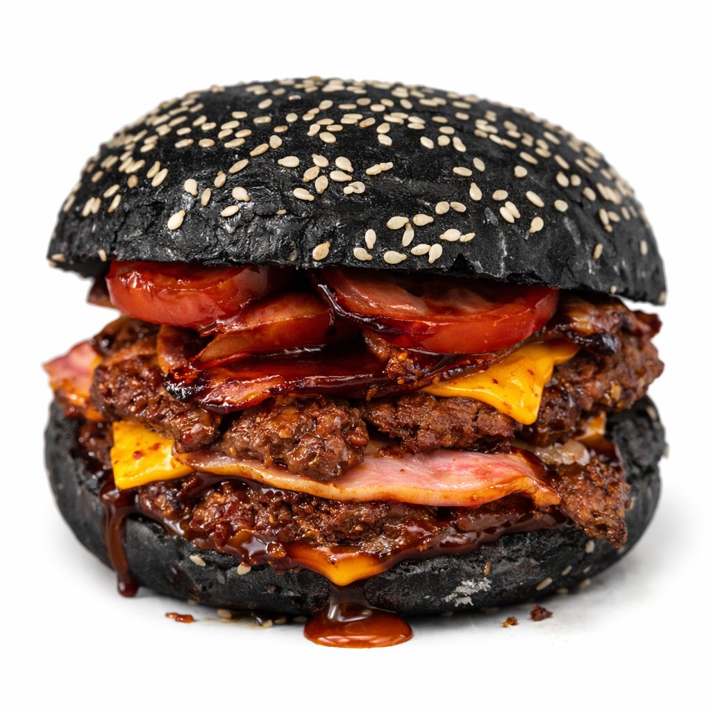 Dvojitá dávka hovězího masa v černé bulkě, zalitá BBQ dipem, s roztaveným cheddarem, křupavou slaninou a rajčetem. Temnej, šťavnatej a nekompromisní.
