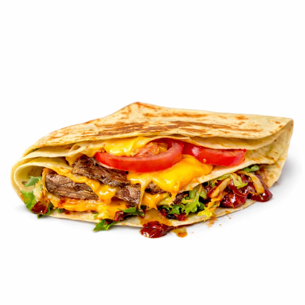 Hovězí maso, dvojitej cheddar, salát s mexickou omáčkou a rajče v tortille. Sýrová. Šťavnatá. Návyková.