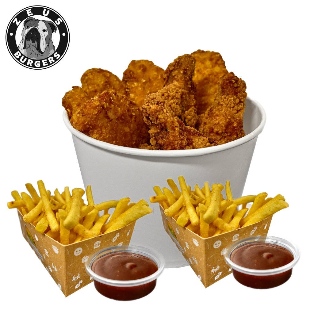 500g mix Hot Wings & strips, 300g hranolků, 2x omáčka. Druhou omáčku, prosíme, napsat do poznámky.